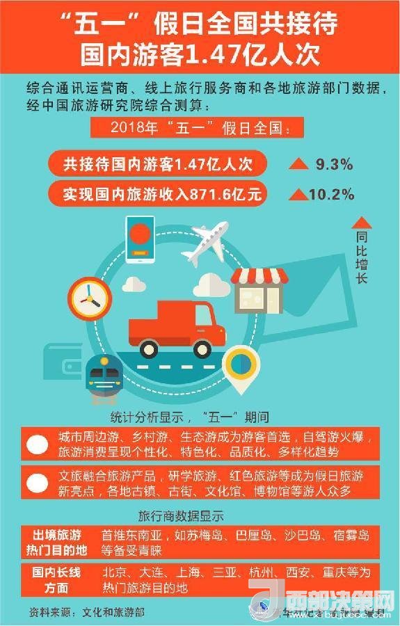 “五一”期間,全國假日旅游消費旺盛,旅游市場持續(xù)增長。綜合通訊運營商、線上旅行服務(wù)商和各地旅游部門數(shù)據(jù),經(jīng)中國旅游研究院綜合測算,“五一”假日全國共接待國內(nèi)游客1.47億人次,同比增長9.3%,實現(xiàn)國內(nèi)旅游收入871.6億元,同比增長10.2%。