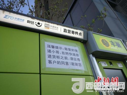 資料圖:北京市某小區(qū)外的快遞柜上張貼提示,提醒快遞員放進貨柜前首先征得收件人同意。中新網 邱宇 攝