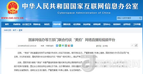 北京6月4日電據(jù)國家網(wǎng)信辦官網(wǎng)消息,近期,“美拍”網(wǎng)絡(luò)直播短視頻平臺(tái)傳播涉未成年人低俗不良信息,破壞網(wǎng)絡(luò)生態(tài),嚴(yán)重影響青少年身心健康。國家網(wǎng)信辦于6月1日會(huì)同廣電總局、文化和旅游部、屬地網(wǎng)信辦依法依規(guī)聯(lián)合約談“美拍”相關(guān)負(fù)責(zé)人,提出嚴(yán)肅批評,責(zé)令全面整改。