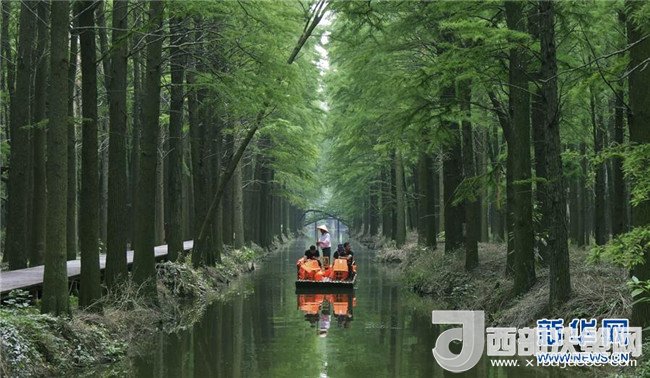 6月5日,游客在江蘇省興化市李中鎮(zhèn)水上森林公園游覽。新華社發(fā)(孟德龍 攝)