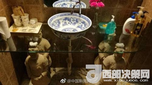 記者在網(wǎng)友曬出的圖片中看到,不僅衛(wèi)生間的墻壁上有兵馬俑的圖案,洗手臺(tái)也由四個(gè)俑“頂”著。