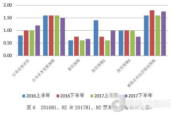 相較于募資、投資、退出指標(biāo)的微降,機(jī)構(gòu)信心指標(biāo)上漲顯示投資人對(duì)2018年北京地區(qū)股權(quán)投資發(fā)展充滿(mǎn)了信心。從預(yù)期分項(xiàng)指標(biāo)看,雖然指標(biāo)所處水平顯示投資人認(rèn)為2018年上半年行業(yè)總體仍將保持平穩(wěn)發(fā)展態(tài)勢(shì),對(duì)自身業(yè)務(wù)發(fā)展預(yù)期、募資預(yù)期、投資預(yù)期保持中性,但是行業(yè)總體評(píng)價(jià)、被投企業(yè)運(yùn)營(yíng)情況預(yù)期、募資預(yù)期、投資預(yù)期這四個(gè)指標(biāo)均較上期有所增長(zhǎng),而自身業(yè)務(wù)發(fā)展預(yù)期指標(biāo)和投資預(yù)期指標(biāo)較上期有所下降,綜合顯示投資人對(duì)行業(yè)和自身業(yè)務(wù)發(fā)展謹(jǐn)慎樂(lè)觀的態(tài)度。
