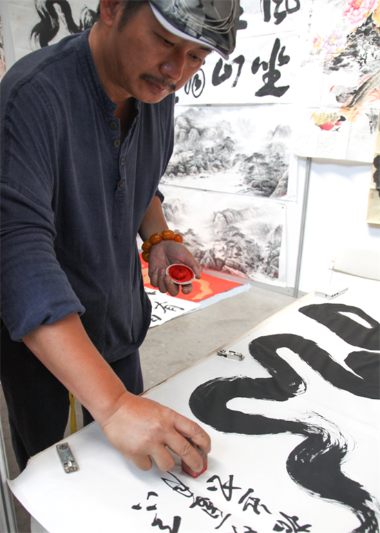 中華一筆龍許超然正在為一幅剛剛創(chuàng)作完成的書法作品落款蓋章