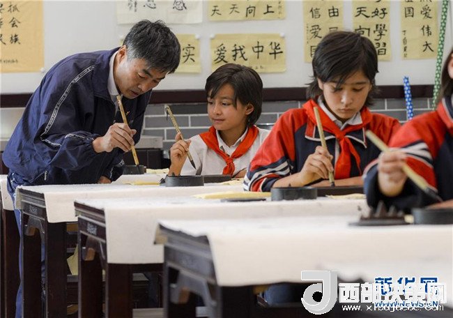 2017年9月26日,在新疆疏附縣托克扎克鎮(zhèn)中心小學書法教室內(nèi),王莊鐵老師在教同學們寫毛筆字。新華社記者 趙戈 攝