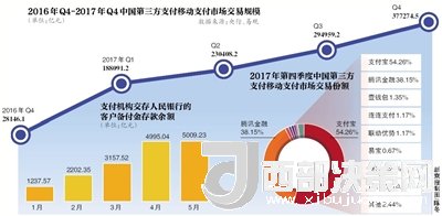 在移動(dòng)支付市場上,支付寶和擁有財(cái)付通、微信支付的騰訊金融雙寡頭局勢(shì)顯現(xiàn)。今年4月,易觀2017年第四季度中國第三方支付移動(dòng)支付市場數(shù)據(jù)顯示,第三方移動(dòng)支付市場交易規(guī)模為37.7萬億元,環(huán)比增長27.91%。其間支付寶和騰訊金融兩巨頭的份額分別為54.26%和38.15%,合計(jì)92.41%。