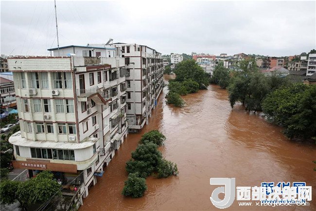 7月3日,四川省內(nèi)江市東興區(qū)田家鎮(zhèn)的小青龍河水位上漲,河邊部分民房被淹。新華社發(fā)(蘭自濤 攝)