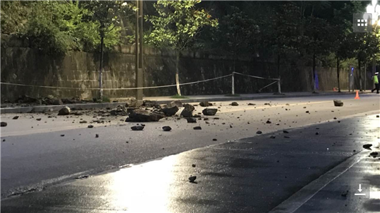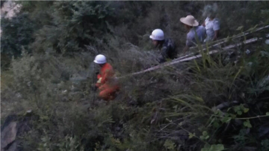接到報警后,大隊及專職隊迅速出動兩輛消防車和10名官兵趕赴現(xiàn)場進行處置,到達現(xiàn)場后,指揮員迅速帶領(lǐng)4名戰(zhàn)斗員立即對險情進行偵查。通過現(xiàn)場偵查,發(fā)現(xiàn)在距離路面高約50米的山梁上,幾個石塊直徑約1米大小,由于連續(xù)幾日暴雨,石塊下土層已經(jīng)流失,導致石塊部分懸空,隨時都有掉落的危險。此時已近夜晚,模糊不清的環(huán)境無形中增加現(xiàn)場處置的難度。指揮員下令,分兩組進行處置,一組由5名戰(zhàn)斗員跟隨一名熟悉該山道路的群眾一起上山,處置"懸石”險情,一組與交警部門拉起警戒線隔離過往車輛和行人。由于“懸石”處無路可通,戰(zhàn)斗員在上到山梁后,系上安全繩下降到懸石旁利用事先準備好的鋼釬對石塊進行起拗,在經(jīng)過兩個多小時的作業(yè)后,全部懸石終于掉落路面,使隱患徹底消除。