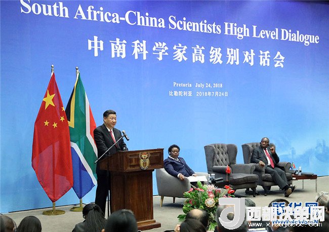 7月24日,國家主席習(xí)近平和南非總統(tǒng)拉馬福薩在比勒陀利亞一道出席中南科學(xué)家高級(jí)別對(duì)話會(huì)開幕式。這是習(xí)近平在開幕式上致辭。 新華社記者 劉衛(wèi)兵 攝