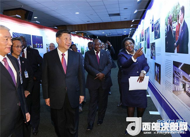 兩國元首共同前往展覽廳,依次觀看展示非洲科技旗艦項(xiàng)目、南非科技成就、中國科技成就、中南科技合作成果的圖片。南非平方公里陣列射電望遠(yuǎn)鏡是包括中國在內(nèi)多國科學(xué)家參與的重點(diǎn)項(xiàng)目,也是中南重點(diǎn)科技合作項(xiàng)目,兩國元首仔細(xì)聽取有關(guān)介紹,并勉勵(lì)雙方科學(xué)家繼續(xù)努力,把項(xiàng)目建設(shè)好。參觀后,兩國元首出席北汽投資項(xiàng)目首輛汽車下線視頻連線儀式。