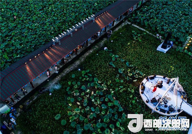 樂隊(duì)組合在浙江省建德市大慈巖鎮(zhèn)里葉村荷田間的舞臺上進(jìn)行演奏(7月14日無人機(jī)拍攝)。新華社記者 徐昱 攝