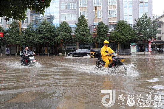 2018年8月4日,云南省昭通中心城市,在積水中行走的人員和車(chē)輛。攝影:張廣玉