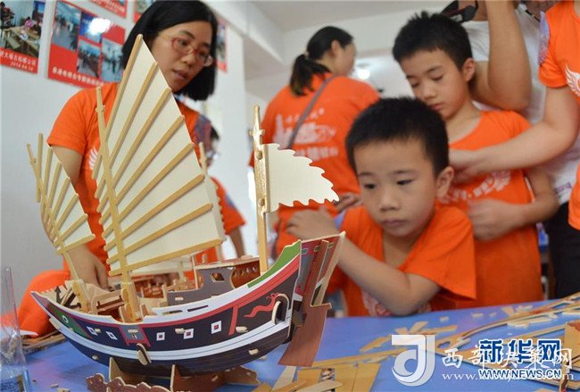 8月8日,“小候鳥”們與家長一起動手拼接福船模型。