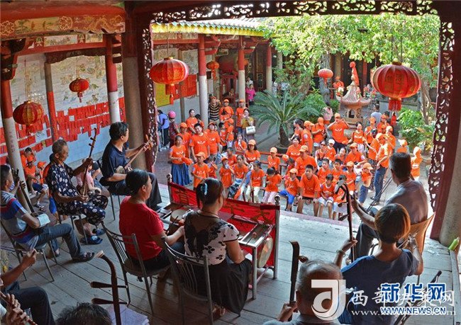 8月8日,“小候鳥”們與家長一起欣賞非物質(zhì)文化遺產(chǎn)——北管。