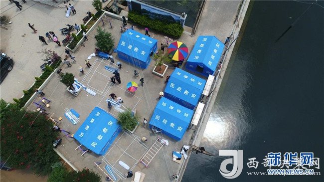 通??h四街鎮(zhèn)中搭起的救災帳篷(8月13日無人機拍攝)。