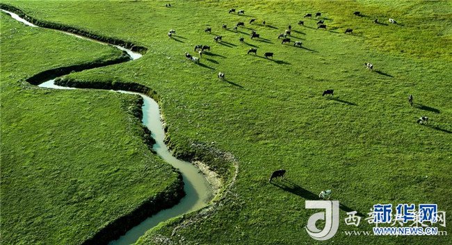 8月22日,牛群在廣靈縣壺流河濕地覓食(無人機(jī)拍攝)。新華社發(fā)(李濤 攝)