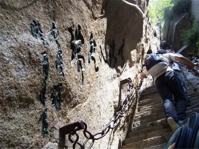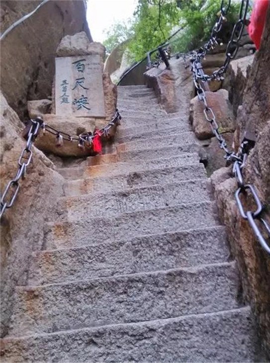 千尺幢位于回心石之上,是華山第一險(xiǎn)境。山幢壁直立,其間僅容二人上下穿行。兩邊鐵鏈垂直下垂,坡度為70°。從上到下共有370多個(gè)臺(tái)階,皆不滿足寬。