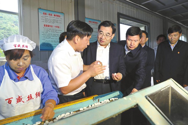 9月13日,省委書記胡和平深入商洛市鎮(zhèn)安縣調(diào)研脫貧攻堅(jiān)工作。圖為在百盛繅絲廠,胡和平了解選繭、繅絲等生產(chǎn)流程,聽(tīng)取公司生產(chǎn)經(jīng)營(yíng)和脫貧幫扶情況介紹。 記者 宋紅梅攝