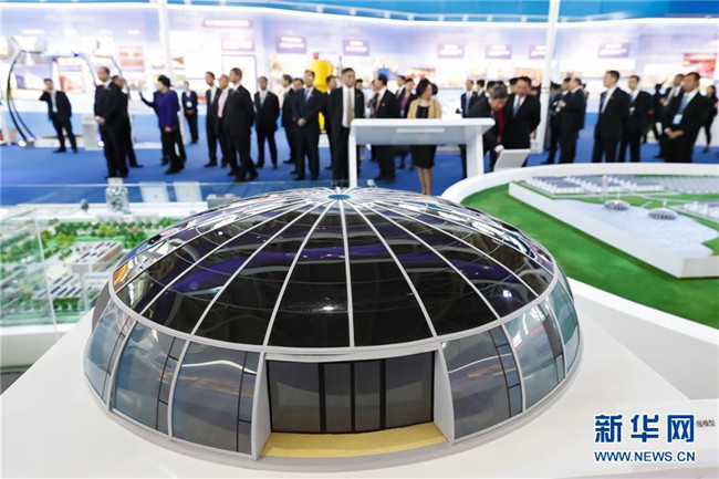 9月19日,觀眾在參觀展覽上展出的光伏住宅小屋模型。9月19日,寧夏回族自治區(qū)成立60周年大型成就展在銀川國際會展中心開幕。記者沈伯韓攝