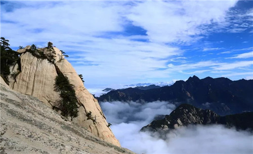 漫步于華山的峰嶺山道,到處可以看到許多與云有關(guān)的景點(diǎn),也能從與云有關(guān)的神奇?zhèn)髡f中,感受到宛若仙境的景象。五云峰是華山諸峰中最富有詩情畫意的一座峰嶺。每逢深秋季節(jié),松翠楓赤,山花耀目,在太陽光的照射下,猶如五色彩云,霓裳般妝扮了山的容顏。在這里,松楓山花都成了五彩云霧。而位于云臺峰以北的白云峰,山峰的若石就如白云一樣漂浮在空中。傳說漢元帝劉爽的女兒南陽公主為避離亂之苦,遠(yuǎn)離塵露,就到白云峰隱居修行,修煉功成,駕鶴乘云而去。