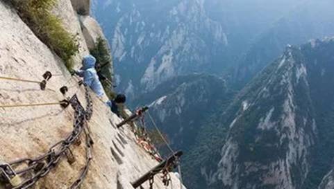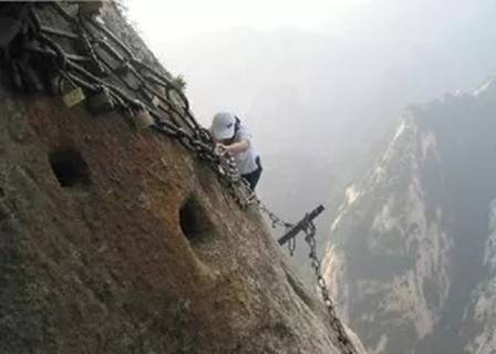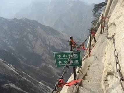 在約2160米高的峭壁上鑿出踏腳之處,鑲嵌石釘搭木椽并用鐵索固定建造的一條懸空棧道,那就是長空棧道。它位于華山極頂南峰東側南天門外的山腰間,經燕子叼表、朝元洞,踩崖隙凌空懸梯下10余華山長空棧道米,沿附懸崖而搭寬不盈尺的方木棧道至全真巖下。