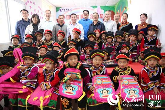 中國電信副總經(jīng)理劉桂清看望慰問泡爾灣村幼教點(diǎn)孩子,并與孩子們合影留念。