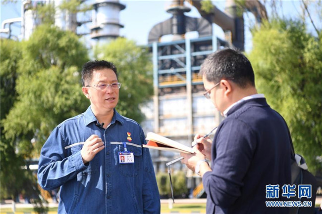 中國(guó)石油遼陽(yáng)石化公司總經(jīng)理、黨委書(shū)記白雪峰向記者介紹情況(9月27日攝)。新華社發(fā)(龍雷攝)