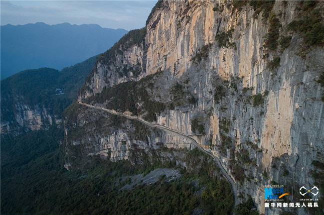 稱其“懸崖天路”,來(lái)源于其險(xiǎn)要的地勢(shì)——上方是巖石,外側(cè)是懸崖峭壁。由于地處海拔1500米的高山,常有云霧繚繞,驚險(xiǎn)萬(wàn)分。新華網(wǎng) 李相博 攝