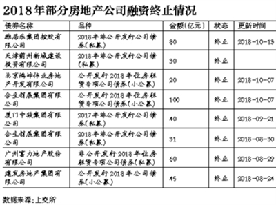 2018年10月份以來,已經(jīng)有多起涉房融資計劃中止/終止。上交所信息顯示,截至10月25日,已經(jīng)至少有8筆涉房融資計劃中止或終止審查。諸如,雅居樂擬發(fā)行的80億元非公開發(fā)行公司債券“終止”,該筆公司債曾于今年7月“中止”發(fā)行。合生創(chuàng)展100億規(guī)模的租賃住宅專項公司債券、天津薊州新城建設投資有限公司30億元的非公開發(fā)行公司債券、北京鴻坤偉業(yè)房地產(chǎn)開發(fā)有限公司20億元的住房租賃專項公司債券“終止”審查。10月份顯示“中止”融資計劃的有:中山招商-時代地產(chǎn)購房尾款資產(chǎn)支持專項計劃,擬發(fā)行金額14.3億元;奧園集團有限公司非公開發(fā)行2018年住房租賃專項公司債,擬發(fā)行金額10億元,等等。