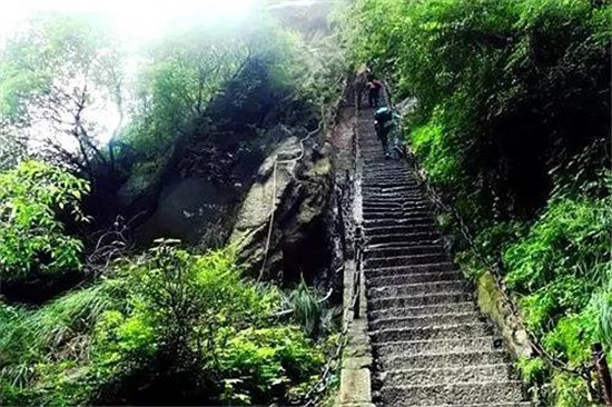 一是直上云頭。如千尺幢、上天梯、否梯、百尺峽等,開鑿于石隙崖壁,直上直下,有聳入云天之勢;二是凌空載道。一邊臨壁,一邊凌空,奇絕險要。如南峰長空棧道、北峰至蒼龍嶺棧道;