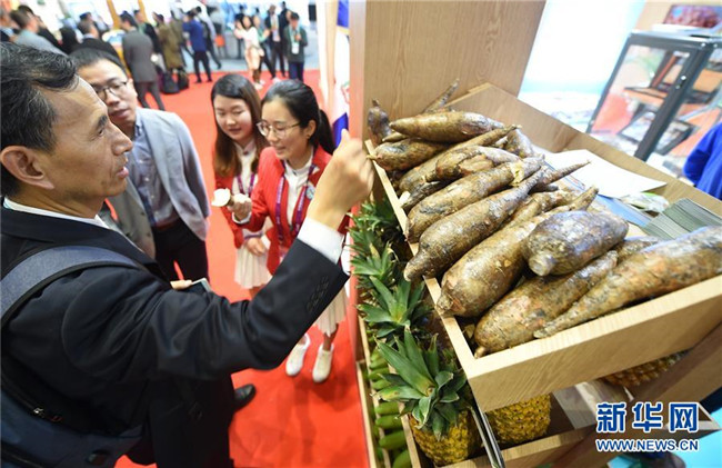 11月6日,參會(huì)者在首屆中國(guó)國(guó)際進(jìn)口博覽會(huì)多米尼加展區(qū)觀看展出的農(nóng)產(chǎn)品。新華社記者韓瑜慶攝