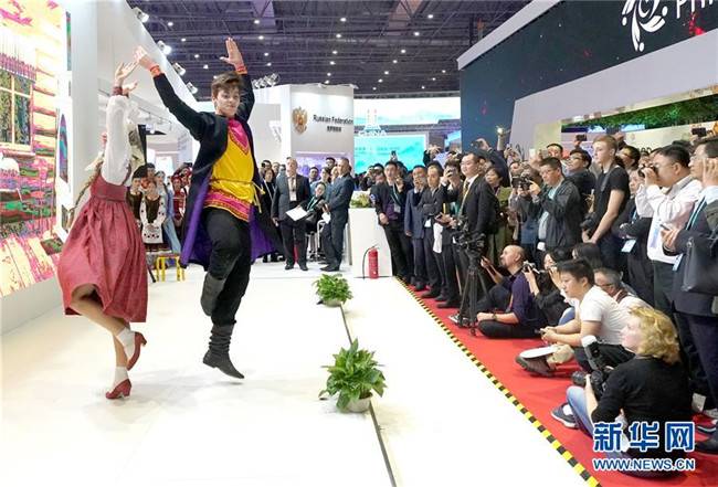 11月6日,俄羅斯演員在首屆中國(guó)國(guó)際進(jìn)口博覽會(huì)俄羅斯展區(qū)表演舞蹈。新華社記者陳建力攝