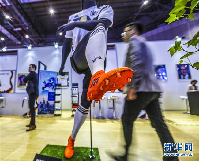 11月6日,參觀者從首屆中國(guó)國(guó)際進(jìn)口博覽會(huì)德國(guó)展區(qū)的德國(guó)足球國(guó)家隊(duì)2018年球衣展品旁走過。新華社記者殷剛攝