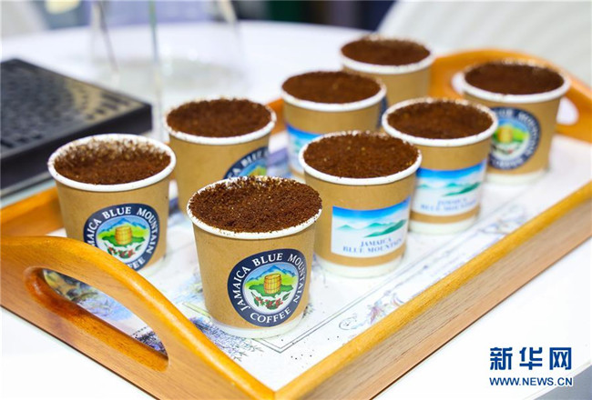 這是首屆中國(guó)國(guó)際進(jìn)口博覽會(huì)加勒比地區(qū)國(guó)家展區(qū)牙買加展臺(tái)展出的藍(lán)山咖啡(11月6日攝)。新華社記者劉大偉攝