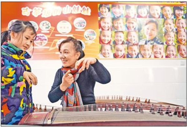 安徽省金寨縣梅山鎮(zhèn)小南京村“山娃娃古箏班”創(chuàng)辦4年來,為三十幾名留守兒童帶來溫暖。創(chuàng)辦人俞曉冬原為南京軍區(qū)前線文工團國家一級古箏演奏家。2014年,她自籌資金20多萬元購置40多架古箏,在小南京學(xué)校建起一間古箏教室,利用音樂課、課余和周末時間無償對山村留守兒童進行古箏培訓(xùn)和音樂教育。一年中,俞曉冬有150多天都住在學(xué)校,與山娃們朝夕相處,孩子們親切地稱她為“古箏媽媽”。一批批山娃娃在小學(xué)畢業(yè)前通過全國器樂水平十級考試,還多次參加國內(nèi)公益演出。圖為俞曉冬老師在教留守兒童學(xué)古箏。(趙樹宴/攝)