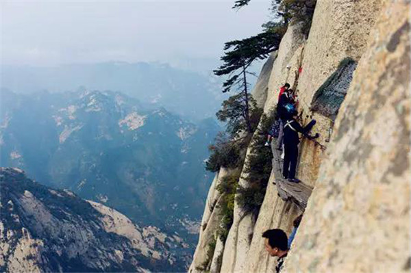 西岳華山歷來被認(rèn)為是五岳之中最為險峻的,而在華山中,險中之險莫過于“長空棧道”和“鷂子翻身”。特別是具有700多年歷史的長空棧道,在華山南峰東側(cè)山腰的萬仞絕壁上鑿出來的幾個踏腳之處,鑲嵌石釘搭木椽搭建了一個百余米懸空的棧道,讓人望而卻步,如果你有恐高癥,僅僅看一眼都會讓你驚恐萬分。2013年,著名旅游網(wǎng)站“Smarter Travel”盤點全球最恐怖懸崖步道,將華山長空棧道列為全球十大最恐怖的懸崖步道之一。