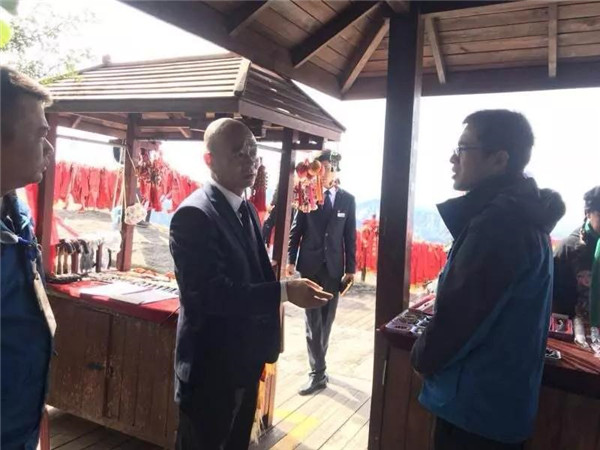其實,雷科峰平時對大家要求挺嚴的,職工背后議論說雷科峰有一種軍人作風,凌厲、硬氣,大家跟上他干事活多還辛苦。印象最深的是那一次美化南天門“三間房一頁瓦”附近的臺地??油莶黄降呐_地上原來蒙著一堆土,晴天一層灰,雨天滿地泥,冬天雪泥一凍一消,平臺就成了沼澤,不說過來過去行走不便,看起來也讓人不舒服,游客常常一不小心就濺得滿身的泥水,很掃興,雷科峰下決心美化平臺。美化平臺所用的沙子、石子、水泥要到二三里路遠的溝底去背。從山頂?shù)綔系祝宦飞先橇⑵露秆?,雷科峰領著十幾名職工利用六天的工余時間,硬是把近二十噸的沙石背了上來。背料過程中,有的職工肩膀磨破了,有的雙腿像篩糠一樣抖個不停,許多職工中途不敢蹴下來休息,怕一蹴下就再也站不起來了,歇息時把沙袋子擱在路邊的石坎上,人站著緩口氣……一個個汗流浹背,氣喘吁吁。