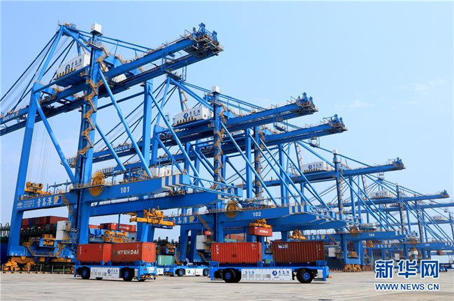 這是2018年5月16日拍攝的青島港全自動化集裝箱碼頭。新華社發(fā)(王培珂 攝)