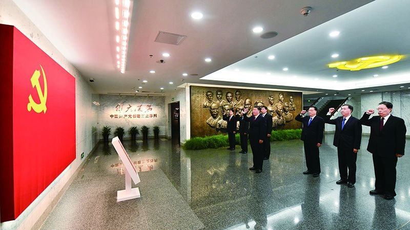 2017年10月31日,中共中央總書記、國家主席、中央軍委主席習近平帶領(lǐng)中共中央政治局常委李克強、栗戰(zhàn)書、汪洋、王滬寧、趙樂際、韓正,瞻仰上海中共一大會址和浙江嘉興南湖紅船。這是31日上午,在上海中共一大會址紀念館,習近平帶領(lǐng)其他中共中央政治局常委同志一起重溫入黨誓詞。 新華社記者 李濤/攝