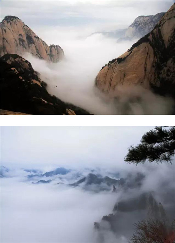 霧日的華山云海,萬山在其中飄動,猶如海中孤島,十分壯觀。雨中的華山云海,似隱似現(xiàn),若輕紗遮面。