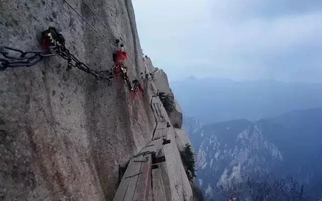 長(zhǎng)空棧道:長(zhǎng)空棧道位于華山南峰東側(cè)山腰,是華山派第一代宗師元代高道賀志真為遠(yuǎn)離塵世靜修成仙,在萬仞絕壁上鑲嵌石釘搭木椽而筑。棧道上下皆是懸崖絕壁,鐵索橫懸,由條石搭成尺許路面,下由石柱固定,游人至此,面壁貼腹,屏氣挪步,被喻為“華山第一天險(xiǎn)”。
