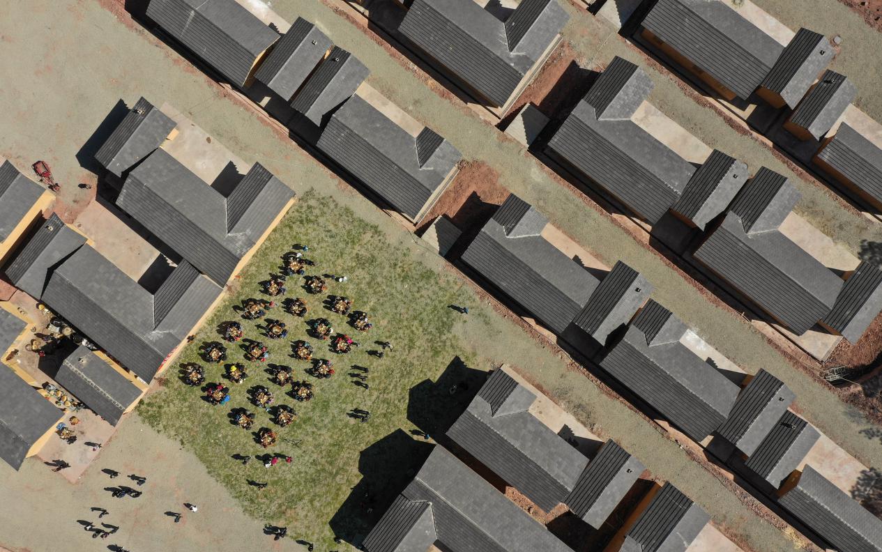 2019年2月11日,在昭覺(jué)縣三河村的易地扶貧安置點(diǎn),彝族群眾圍坐在一起吃起壩壩宴,熱熱鬧鬧地慶祝喬遷之喜。來(lái)源:新華網(wǎng)