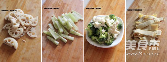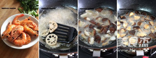 主料:雞翅中6個  大蝦6個  木耳60克  藕100克  豆皮100克  青筍200克  鮮香菇100克  西蘭花100克  菜花100克  金針菇1小把