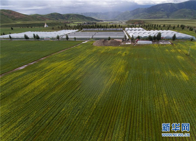 這是理塘縣濯桑鄉(xiāng)濯桑現(xiàn)代農(nóng)業(yè)雙創(chuàng)中心(2018年8月11日無人機拍攝)。理塘縣甲洼鎮(zhèn)、濯桑鄉(xiāng)等鄉(xiāng)鎮(zhèn)集中使用產(chǎn)業(yè)扶持資金,跨村集中抱團發(fā)展設施蔬菜大棚,讓貧困人口在園區(qū)獲得穩(wěn)定收益。新華社記者 江宏景 攝