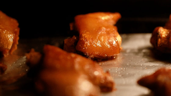 6.將烤盤上鋪上錫紙,并在錫紙上抹上一層薄薄的油,防止烤的時(shí)候豬蹄會(huì)粘在錫紙上,放上煮好的豬蹄。