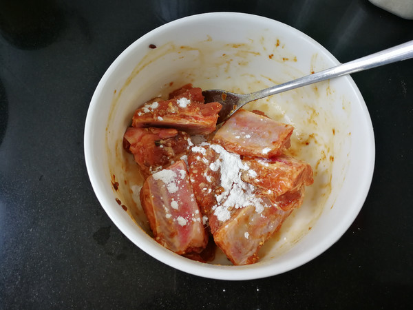 2.把砍成段的排骨泡去血水,加入調(diào)味料、一點(diǎn)油拌好,腌上20分鐘