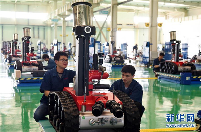 2018年3月30日,員工在位于江西共青城的中信重工開誠智能裝備有限公司生產基地組裝防爆消防滅火偵察機器人。 新華社記者 宋振平 攝