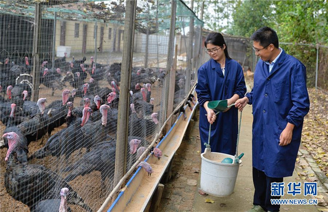 在江蘇省建湖縣陳甲村,返鄉(xiāng)創(chuàng)業(yè)的魯曼(左)和丈夫在養(yǎng)殖基地喂養(yǎng)火雞(2015年9月23日攝)。魯曼和丈夫的返鄉(xiāng)創(chuàng)業(yè),帶動陳甲村發(fā)生巨變,回首創(chuàng)業(yè)的經歷,已是全國人大代表的魯曼直言:“奮斗是艱辛的,也是幸福的。” 新華社記者 季春鵬 攝