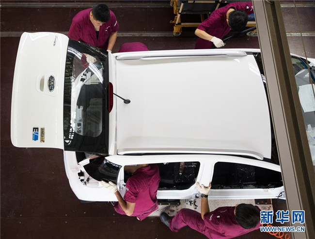 2018年8月7日,工人在安徽江淮汽車集團股份有限公司安慶分公司新能源汽車總裝生產線上安裝純電動車。 新華社記者 金立旺 攝