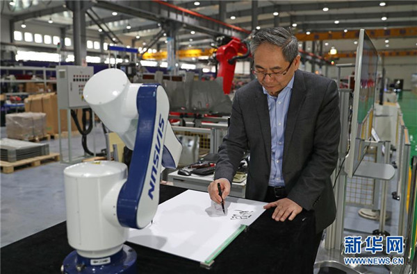 3月29日,沈陽(yáng)新松機(jī)器人自動(dòng)化股份有限公司創(chuàng)始人兼總裁曲道奎和公司生產(chǎn)的機(jī)器人共同書寫“愛國(guó)奮斗”字樣。 新華社記者 楊青 攝
