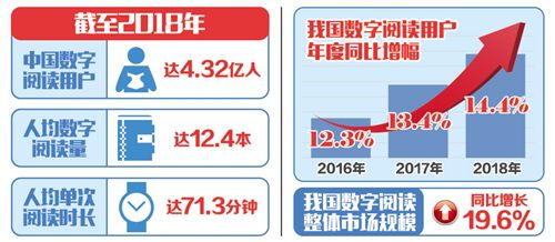 4月12日至14日,第五屆中國數(shù)字閱讀大會在杭州召開。會上發(fā)布的《2018年度中國數(shù)字閱讀白皮書》顯示,截至2018年,中國數(shù)字閱讀用戶總量達到4.32億,人均數(shù)字閱讀量達到12.4本,人均單次閱讀時長達71.3分鐘。我國數(shù)字閱讀整體市場規(guī)模已達到254.5億元,同比增長19.6%,大眾閱讀市場規(guī)模占比逾九成,是產(chǎn)業(yè)發(fā)展主導(dǎo)力量。